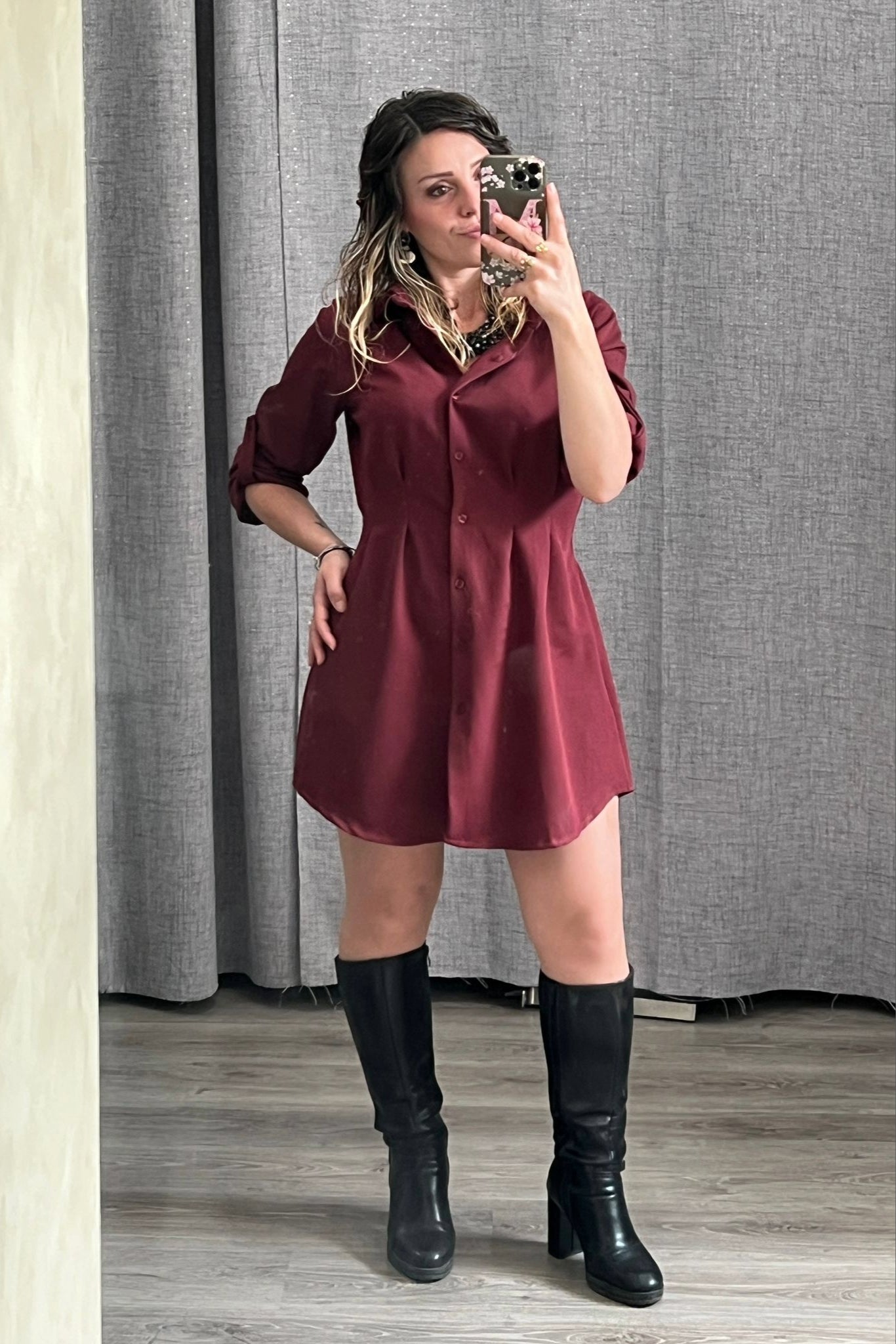 Abito a camicia con elastico sulla parte posteriore e pences sul davanti che evidenziano il punto vita e la silhouette anche senza indossare una cintura. L'abitino è una taglia unica che veste bene e comoda fino a taglia L/XL.