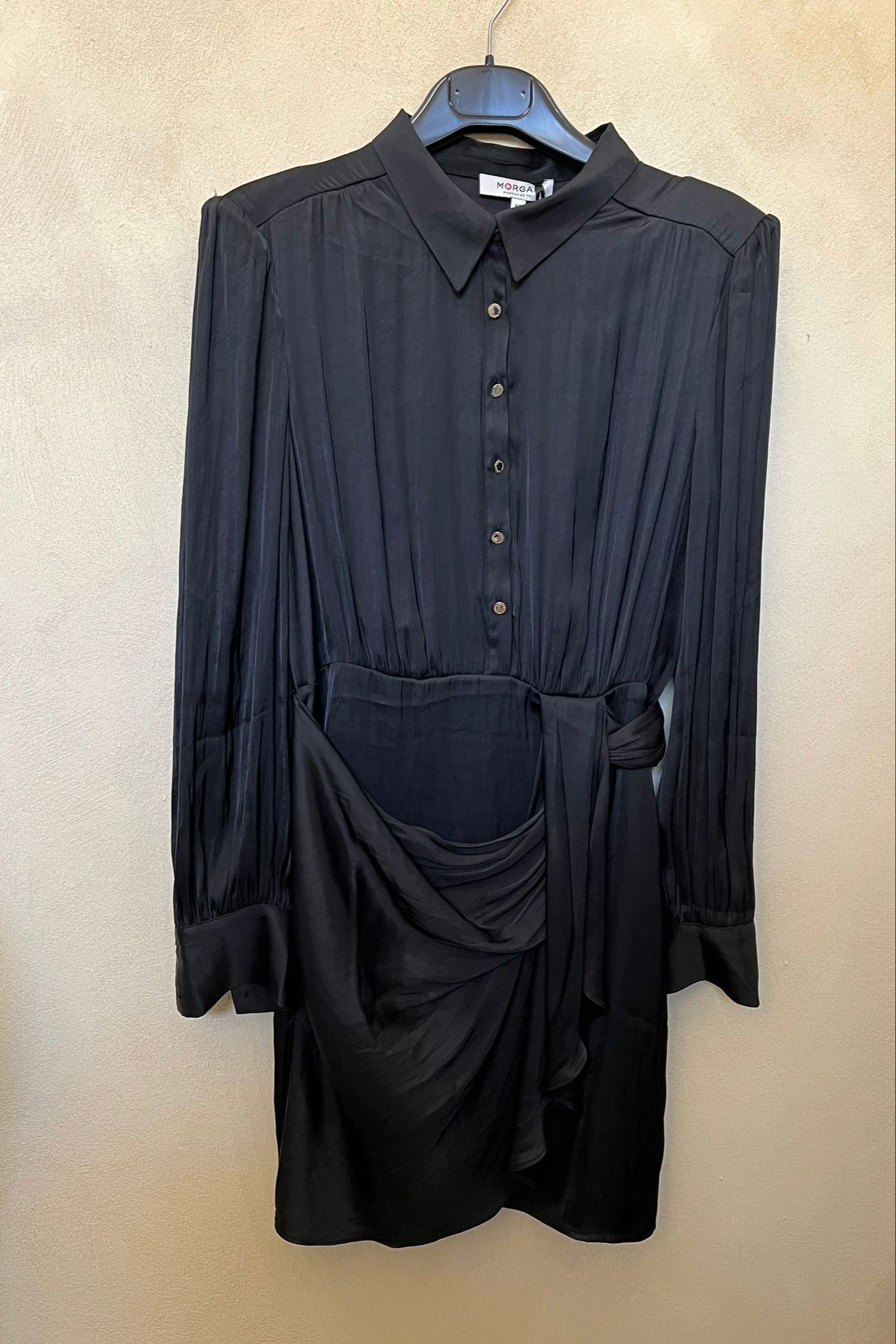 Abito modello chemisier in tessuto simil raso che rende l' outfit fluido, armonico grazie anche al particolare drappeggio sulla zona addominale. Le spalline sono rinforzate. Questo modello di abito è indicato per body shape a triangolo perchè va a bilanciare la figura.