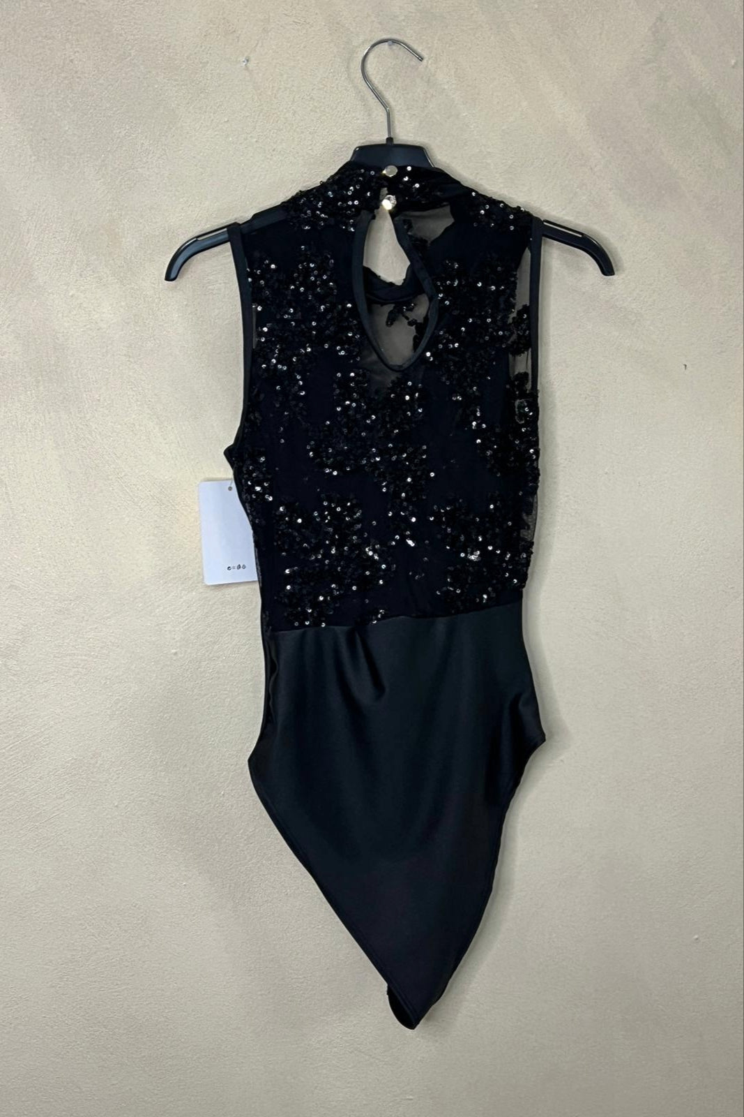 Body smanicato con rifiniture in tulle avanti e dietro decorato in pailettes. Chiusura con doppio bottoncino dietro. Vestibilità comoda fino a taglia M max