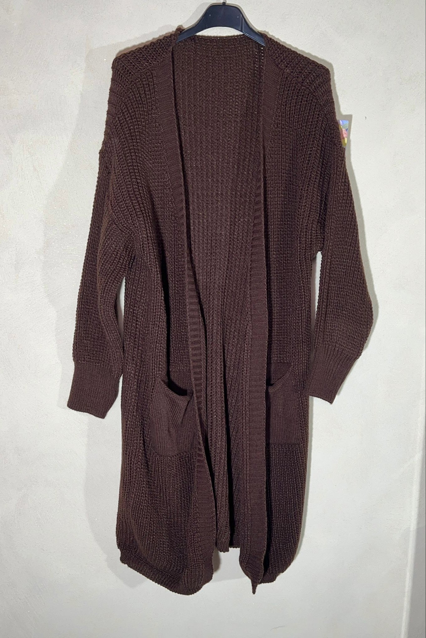 Cardigan lungo taglio over con comode tasche. Ideale per look comodi, caldi e confortevoli.