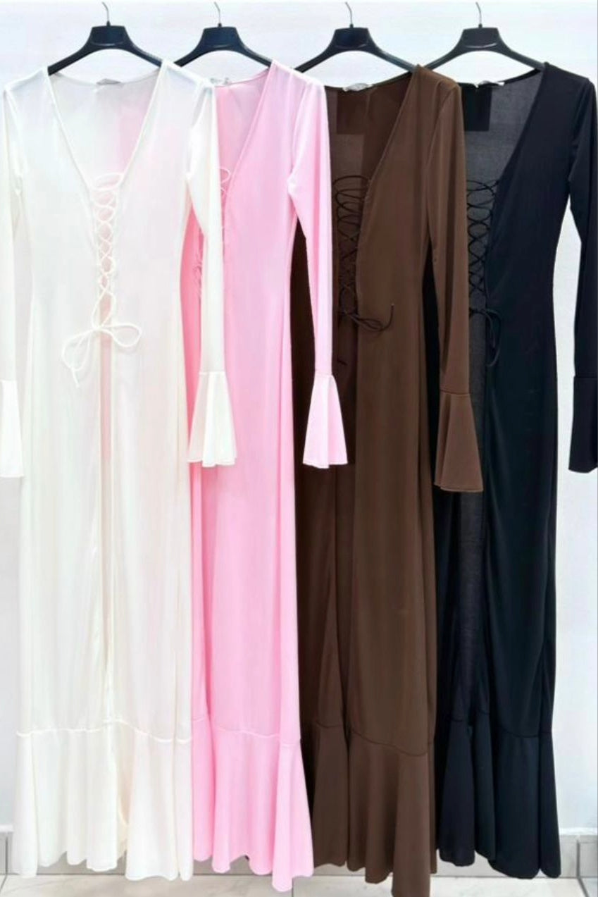 Cardigan mezza stagione lungo, con manica a campana e laccetti per la chiusura sul davanti. Ideali per completare gli outfit. Veste comodo da taglia Xs fino a taglia L