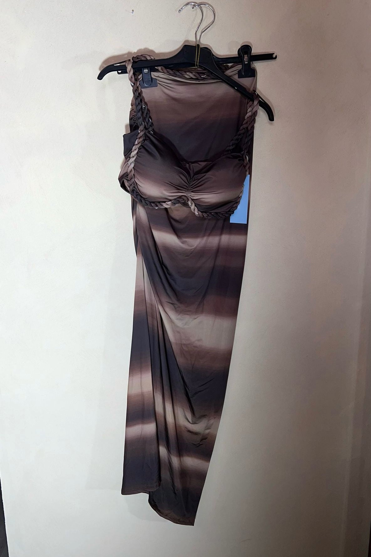 Completo composto da top e gonna. Sia il top che la gonna riportano dettagli a treccia. Il top ha le coppe preformate e la gonna invece ha uno spacco laterale. Ideale come look estivo in quanto fresco e super colorato. Veste aderente mettendo in risalto la silhouette. Consigliato fino a taglia M