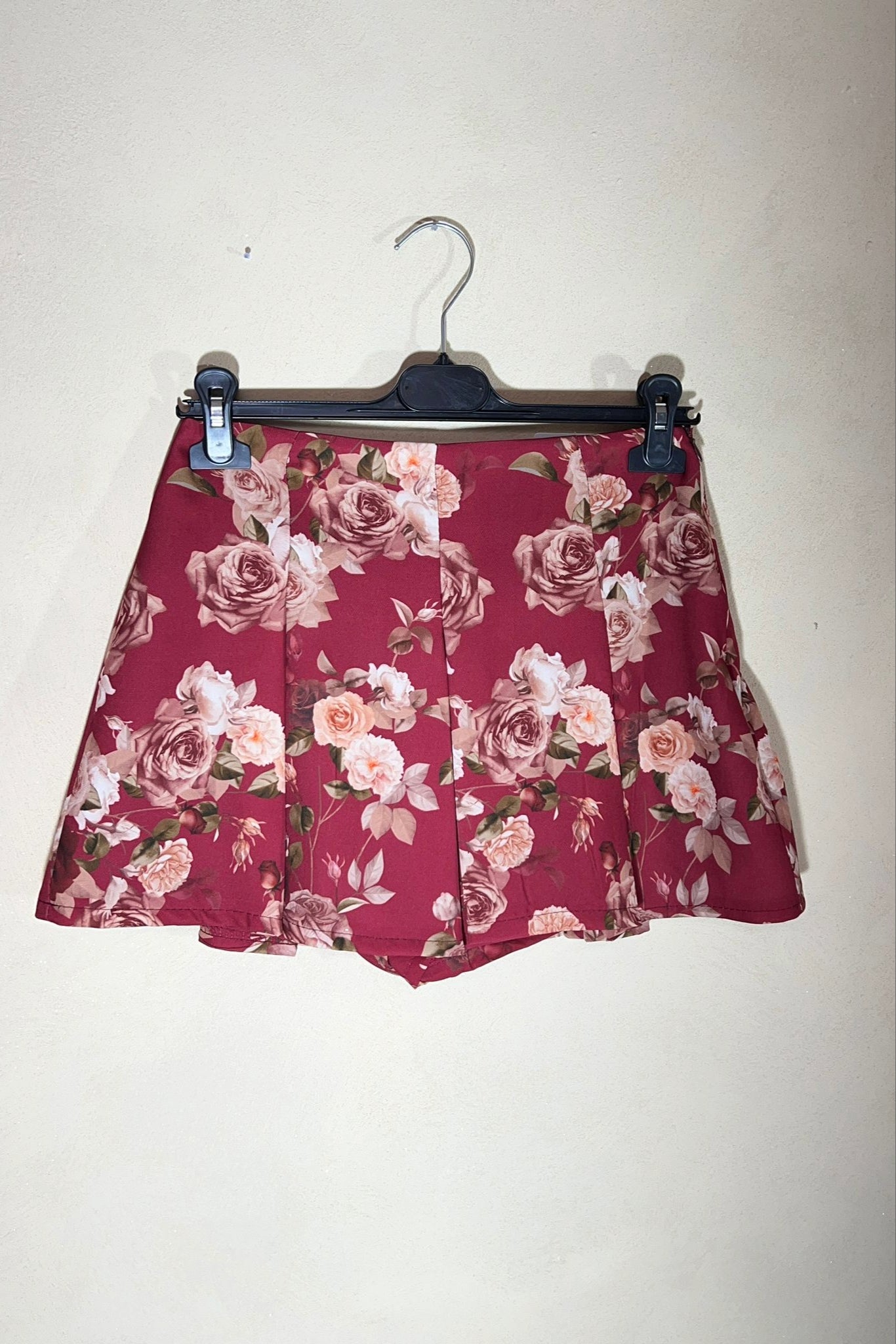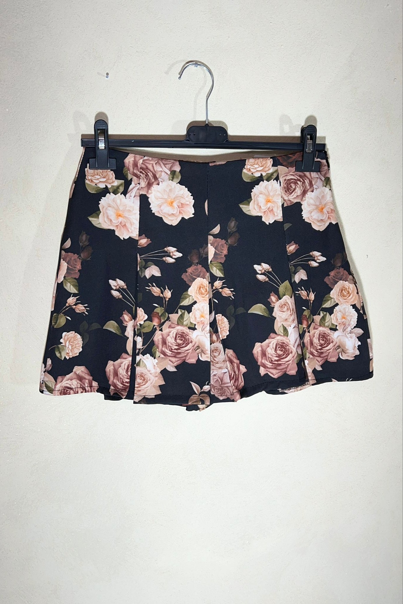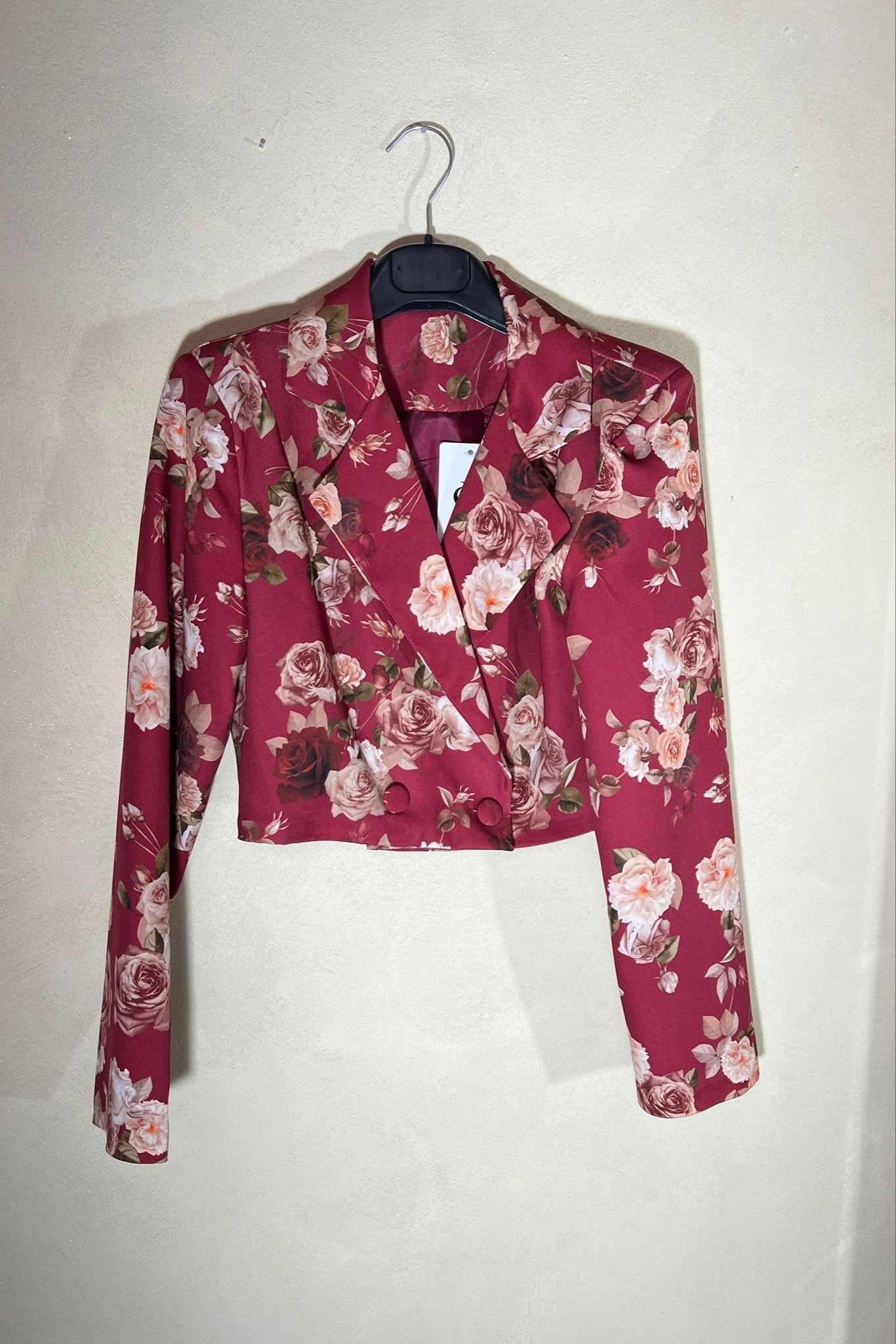 Completo a fantasia floreale composto da giacchetto e pantaloncino. Il giacchino ha lo scollo a v, la chiusura a doppio petto e le spalline rinforzate. Il pantaloncino ha le pieghe avanti e dietro come fosse una gonna e la chiusura con zip laterale. Il giroseno della giacca misura 84 cm circa, il girovita del pantaloncino ha una misura di 73 cm circa.