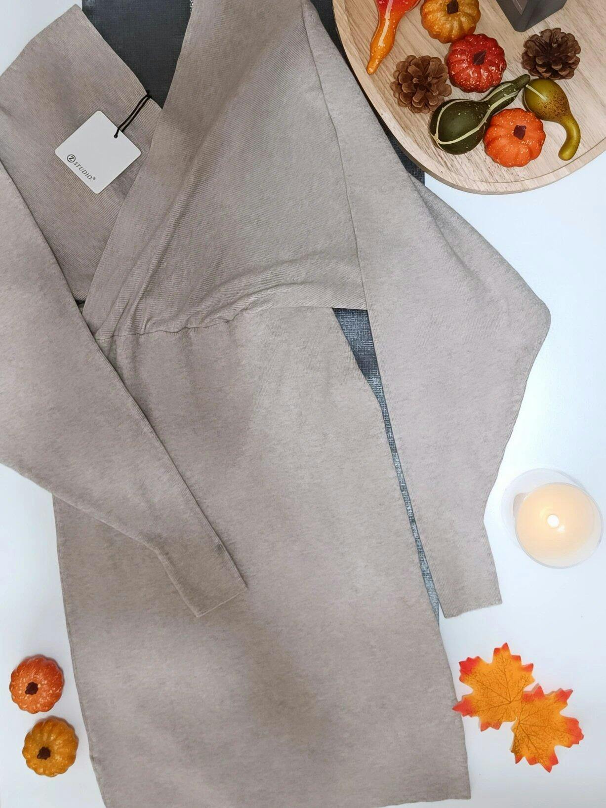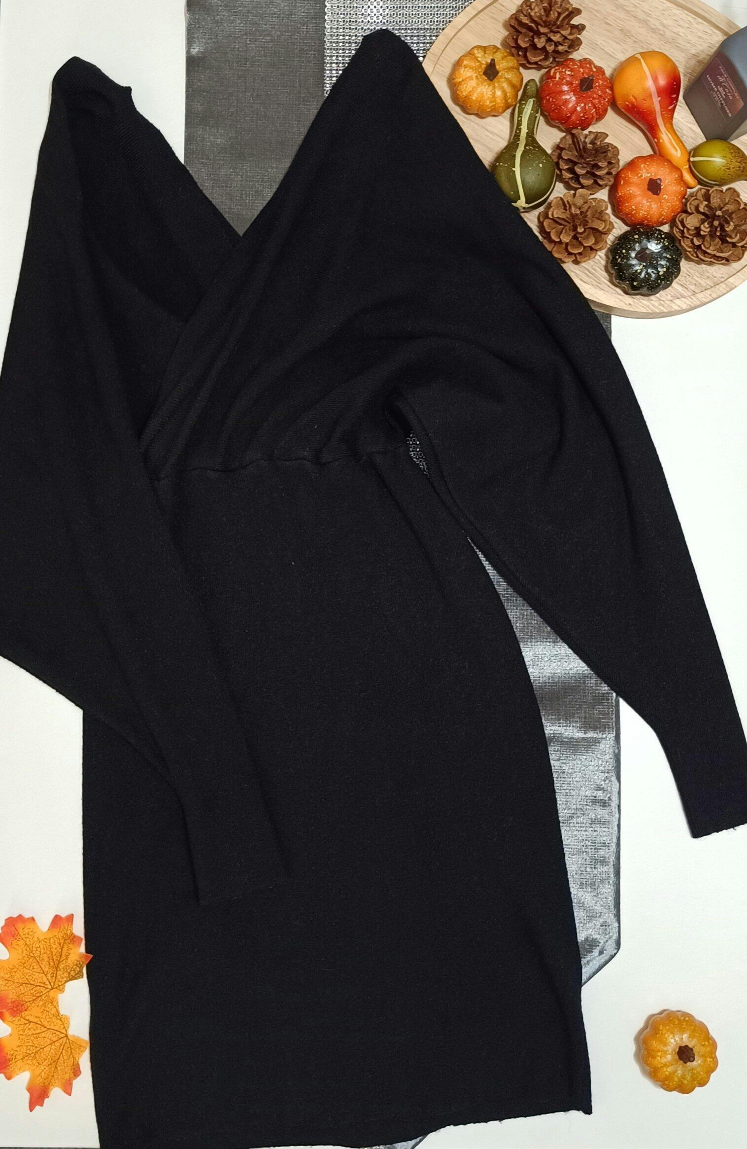 Dress in maglina, con ampio scollo a v. Il punto vita è ben delineato e messo ancora pià in evidenza grazie alle ampie maniche. Veste comodamente fino a taglia XL