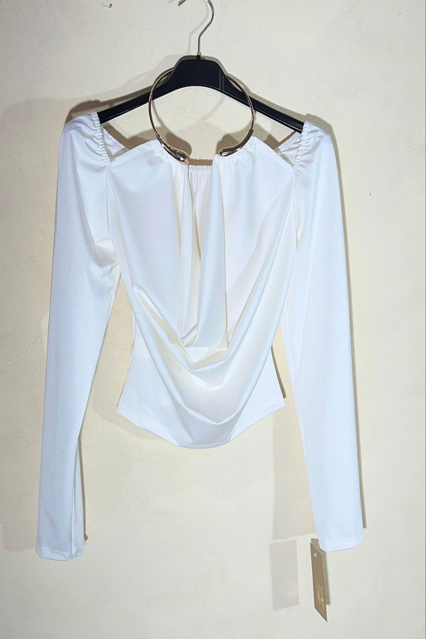 Maglia aderente con scollatura particolare formata da un anello dorato. Vestibilità comoda fino a taglia M/L