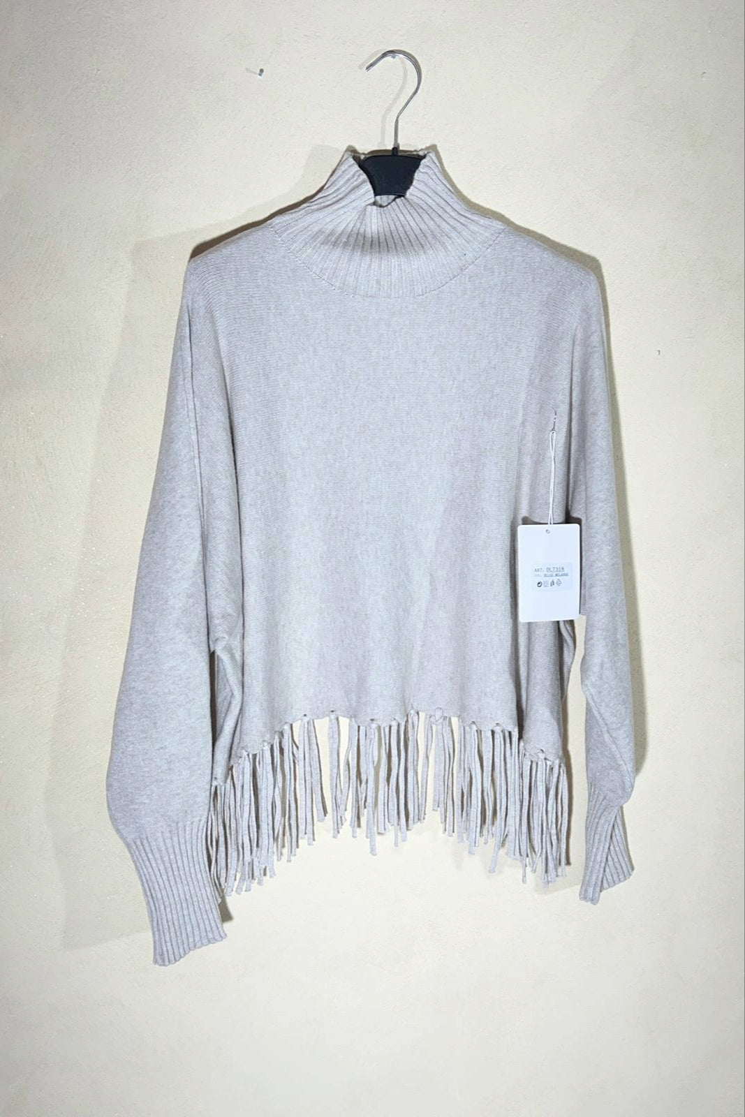 Maglioncino con collo rialzato, manica morbida e frange sul fondo. Morbido ed elasticizzato, veste comodamente fino a taglia XL.