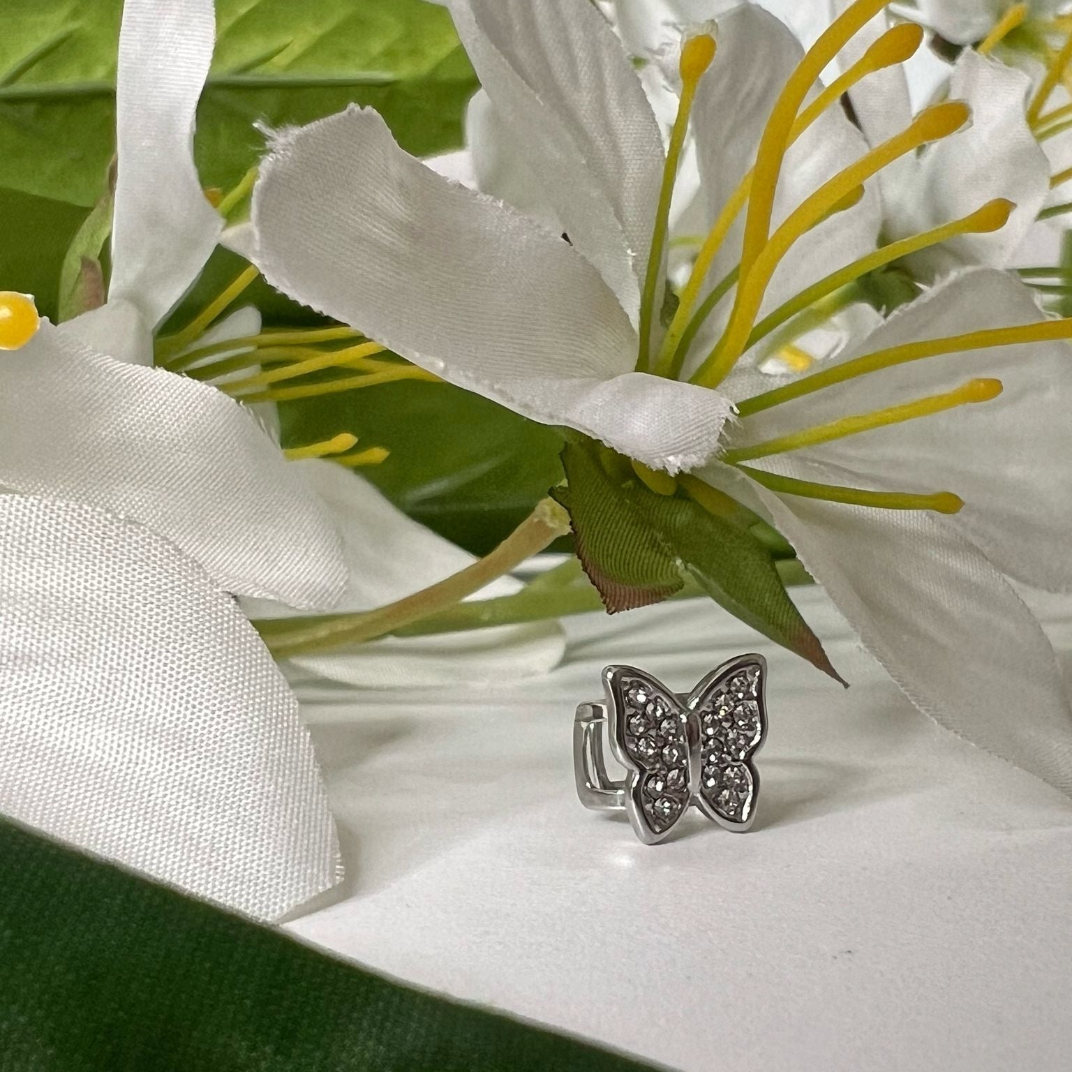 Minicaf in acciaio inossidabile a forma di farfallina. Le ali sono impreziosite con minuscoli strass