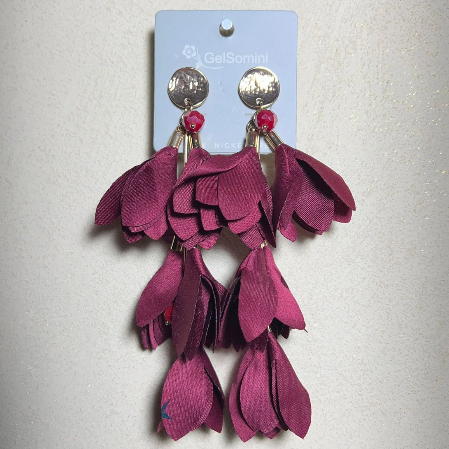 Orecchini pendenti con base oro e petali in tessuto colorati. Sono leggeri e nickel free.