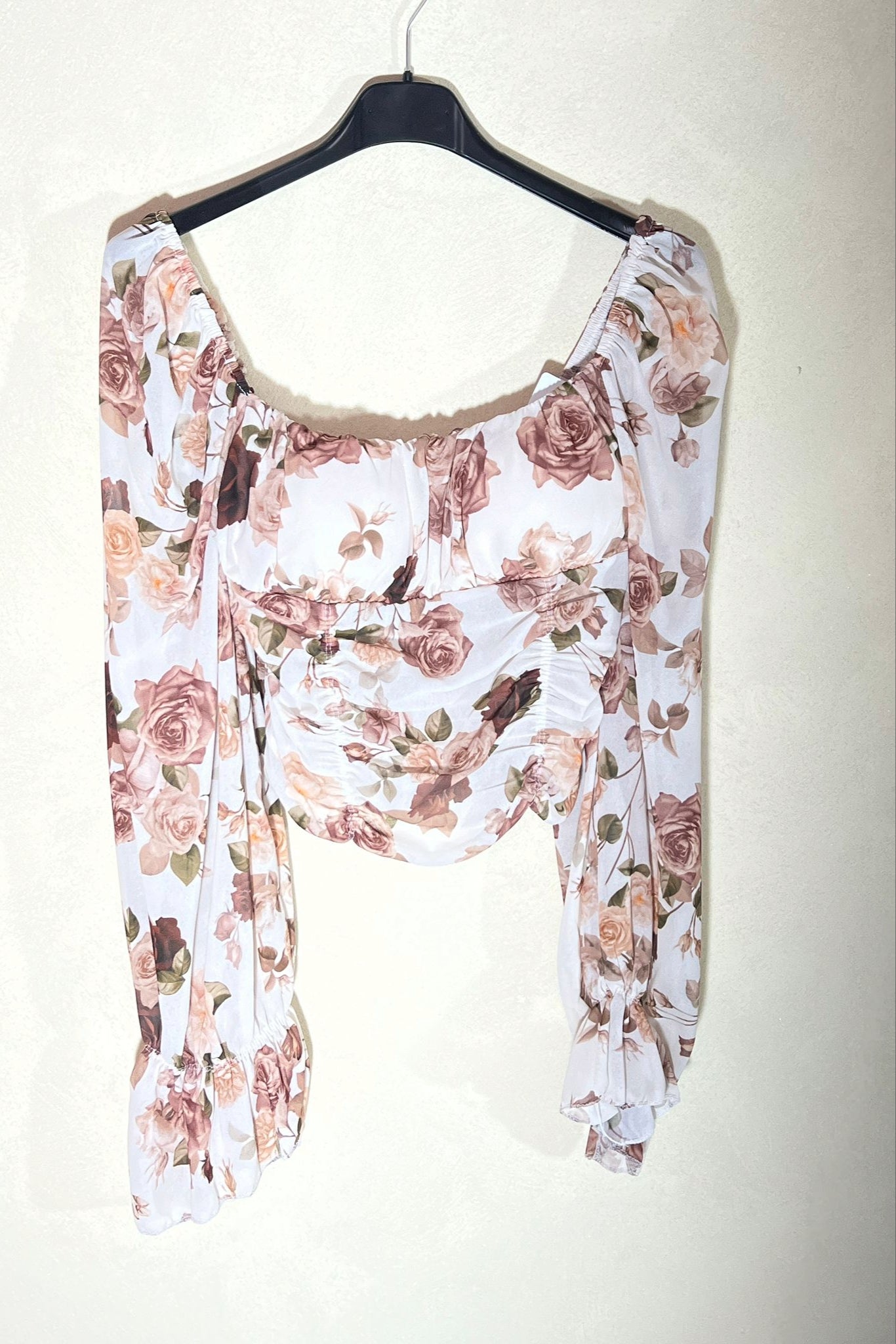 Top a fantasia floreale a mania lunga. Le maniche sono velate con elastico sul polsino. Scollo morbido ed elasticizzato, coppette preformate e drappeggio sul busto. Ideale per look autunnali.
