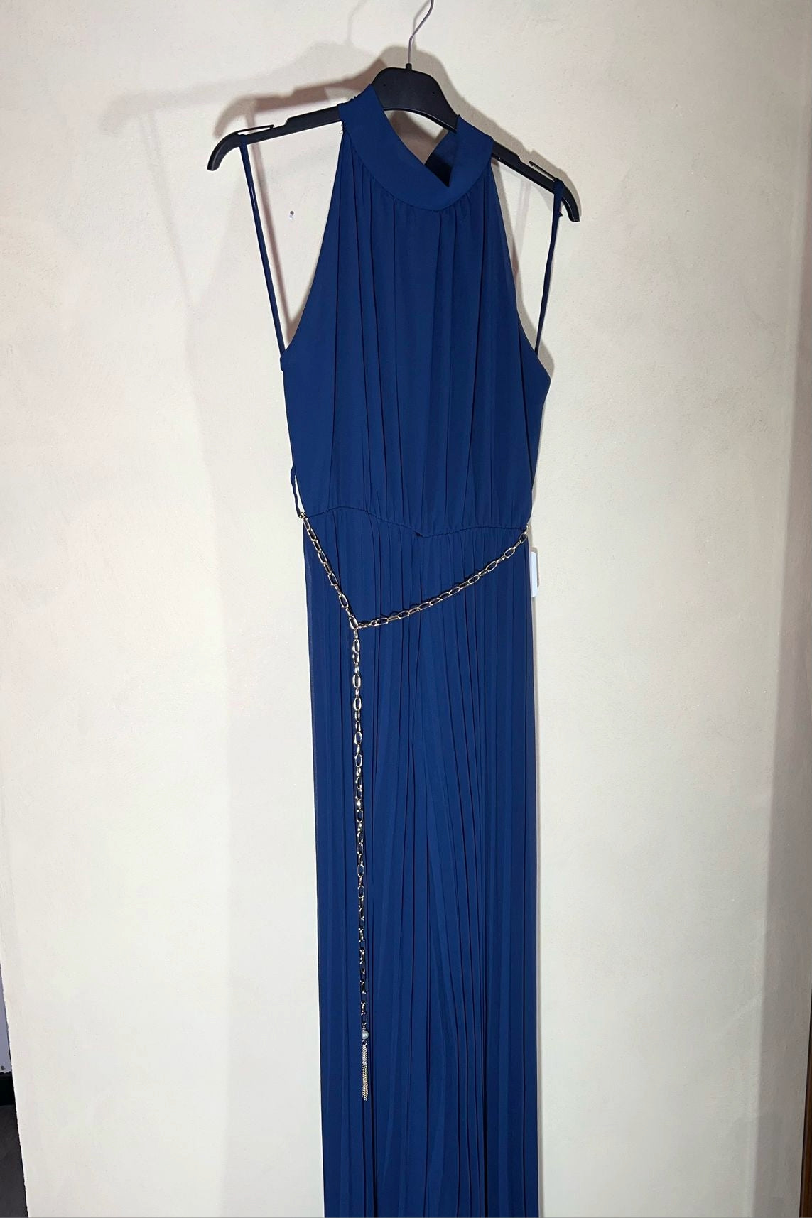 Tuta intera con scollo all'americana che si chiude con fiocco dietro al collo. La parte inferiore quella del pantalone è tutta plissettata. La tutina è elasticizzata e porta una cinturina di color oro. La vestibilità arriva fino a taglia XL abbondante.